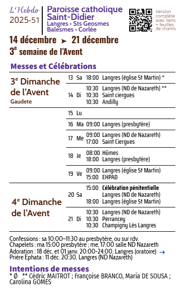 - Présence d’un prêtre, le vendredi de 16h30 à 18h